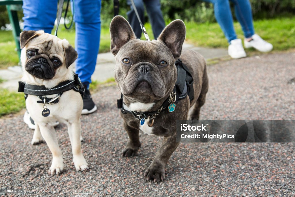 A young pug and french bulldog posing together for the camera, while being taken on a walk.